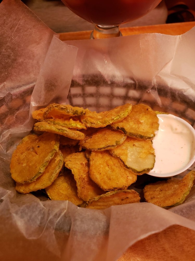 Shareable basket of golden-fried pickle chips served with Ranch or Cajun sauce for dipping